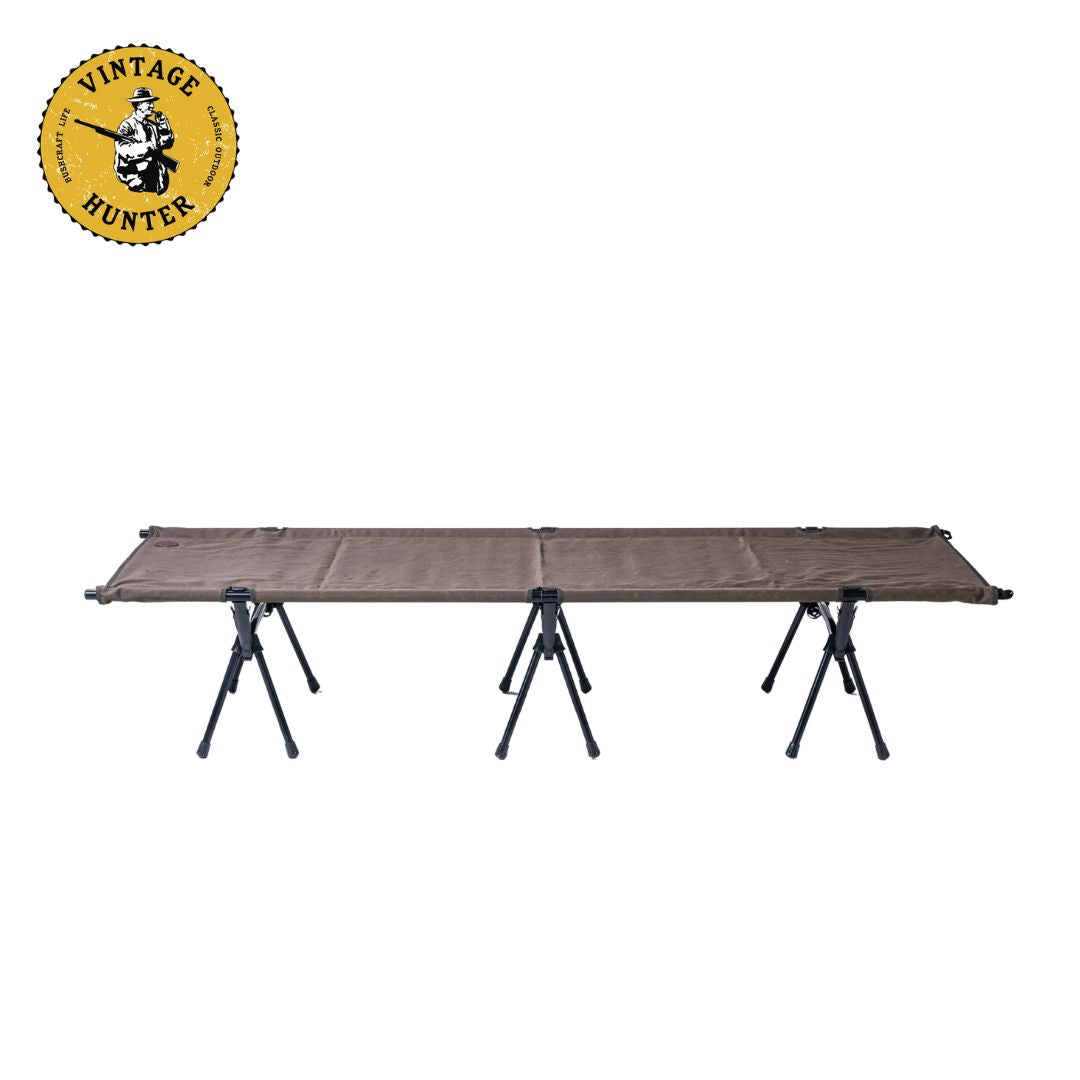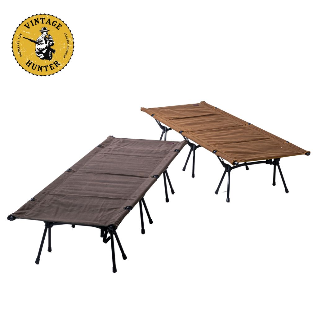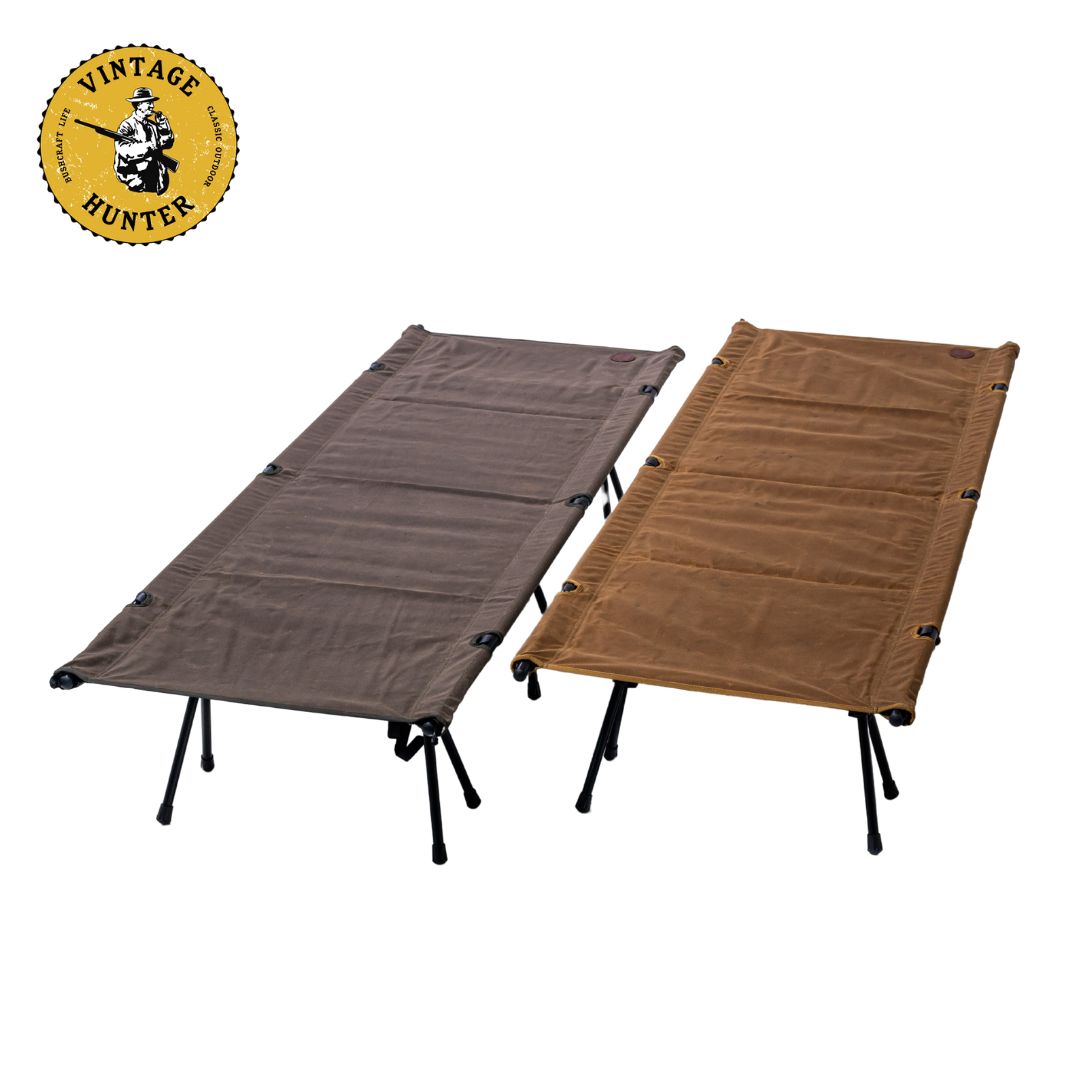 極厚のオイルワックスキャンバスに、ヴィンテージ感漂うレザーディテールを施した「オイルワックスキャンバス コット」。アウトドアを知り尽くした台湾発・Vintage Hunterによる、世界初のフルキャンバス仕様の折りたたみ行軍床です。