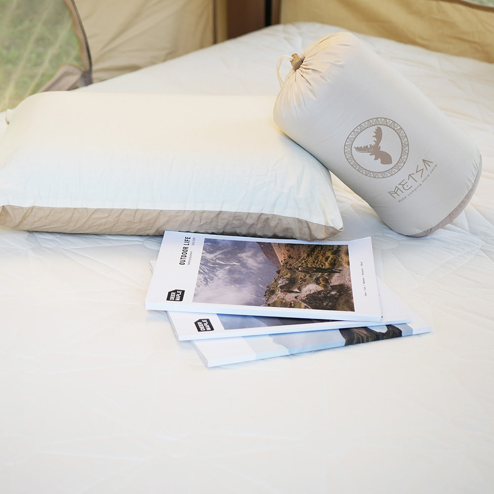 Metsä眠月リバーシブルキャンプピローは、アウトドアから日常まで使える2WAY寝心地設計のポータブル枕です。ふんわり柔らか面としっかりサポート面のリバーシブル仕様。首と肩に優しいエルゴ設計で、キャンプや車中泊、自宅での快眠をサポートします。用途に合わせて選べる2サイズ展開(R65・H45)で、どこでも快適な眠りを実現。